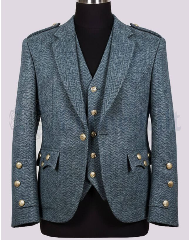 Choosing to buy Blue Tweed Argyll Jacket means your outfit will look smart at all formal or family events. Pockets let you keep small items handy, and the matching waistcoat completes your outfit with a touch of class. Wear this Blue Tweed Scottish jacket mens piece with your favorite kilt or trousers for a look that stands out. Each piece is made to last, so you can trust it for years of wear.