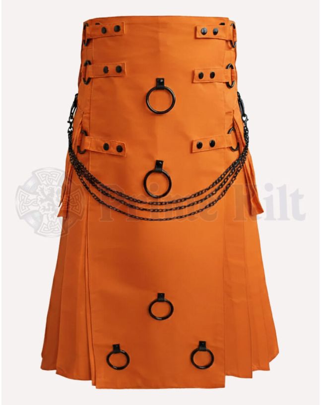 Experience the comfort of an adjustable Gothic kilt. The waistband easily adapts, so you get a snug fit every time. Tough buckles and sturdy buttons hold up for years of wear. Large pockets add convenience, letting you carry your essentials with ease. The high-quality fabric is both soft and durable, designed for everyday use. Its orange color won’t fade, even after many washes. Shop Gothic kilt men online with confidence, knowing you're choosing durability and unique design.