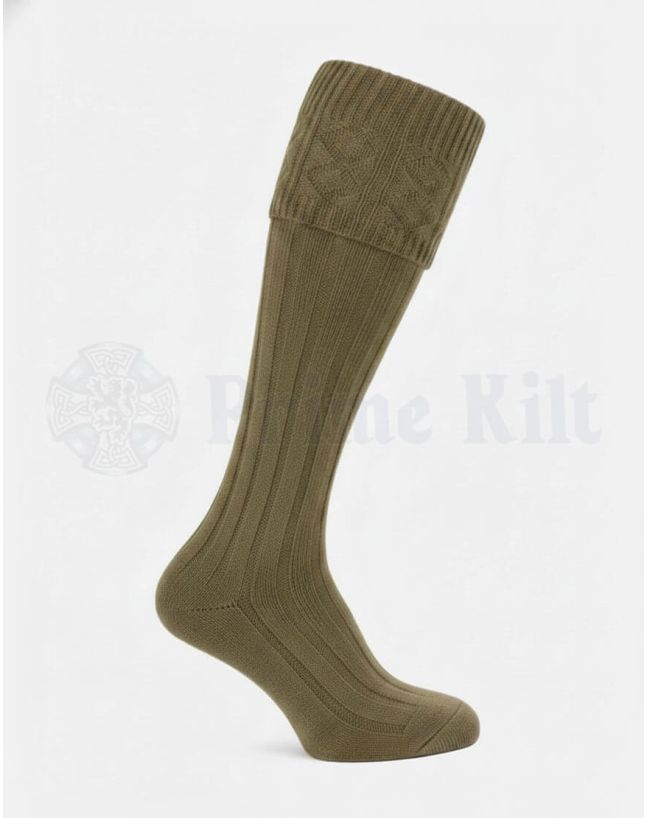 Our Kilt Socks offer a smart, timeless look in versatile khaki. This neutral color pairs well with any kilt tartan and most other khaki kilt accessories. The snug fit holds your socks up firmly, keeping you neat and smart throughout the event. These Scottish kilt socks khaki feature reinforced heels and toes for long-lasting wear. Buy khaki kilt socks today for comfort, style, and durability you can trust with every formal or casual occasion.
