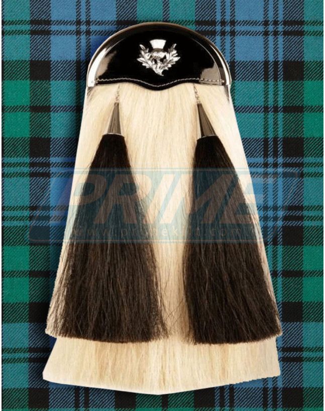 Add timeless style to your Highland dress with the Leather Patent Cantle Horsehair Sporran. Crafted for tradition, this sporran pairs genuine black leather and elegant white horsehair with a shiny patent finish. Every detail stands out, from the polished cantle to the bold horsehair tassels. This sporran completes your kilt and secures essentials at your side. Feel proud knowing you own a quality piece that reflects Scottish heritage and expert workmanship.