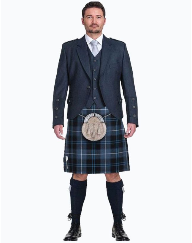 Outfit Includes 1. Jacket with waistcoat (Color you select) 2. 8 Yard Kilt 3. Matching Tartan Fly Plaid 4. Matching Tartan Flashes 5. Dress Sporran With Chain 6. Kilt Belt with Buckle 7. Fly Plaid Brooch 8. Kilt Pin 9. Ghillie Brogue Kilt Shoes 10. Kilt Hose Socks 11. Sgian Dubh 12. Bow Tie